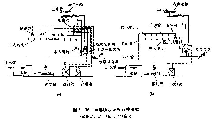 雨淋噴水滅火系統(tǒng)工作原理:當建筑物發(fā)生火災時,由自動控制裝置打開集中控制閘門,使整個保護區(qū)域所有噴頭噴水滅火。