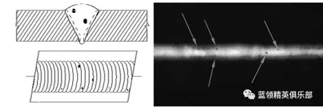 氣孔內(nèi)部充滿氣體,射線穿過氣孔幾乎不會形成材質(zhì)衰減。在射線底片上氣孔呈暗色斑點,中心黑度較大。單個氣孔邊緣較淺平滑過渡,輪廓規(guī)則較清晰,密集氣孔成團狀。氣孔大多是球形的,也可以有其它形狀,氣體的形狀與焊接條件密切有關(guān)。