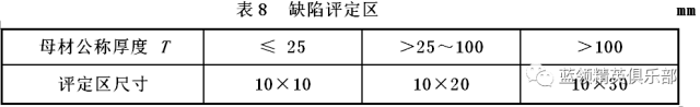 “5.1.5.1 圓形缺陷用圓形缺陷評定區(qū)進行質(zhì)量分級評定,圓形缺陷評定區(qū)為一個與焊縫平行的矩形,其尺寸見表8。圓形缺陷評定區(qū)應選在缺陷最嚴重的區(qū)域。